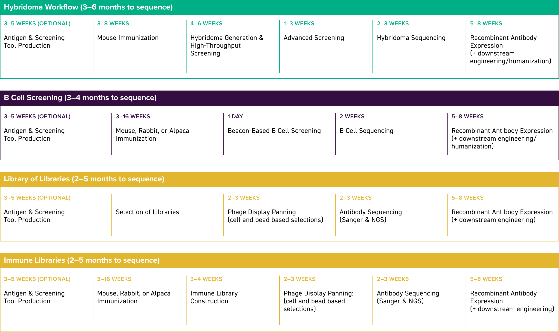 We can also design and generate highly-diverse custom VHH libraries tailored to your program's needs in as little as 3 to 4 weeks.