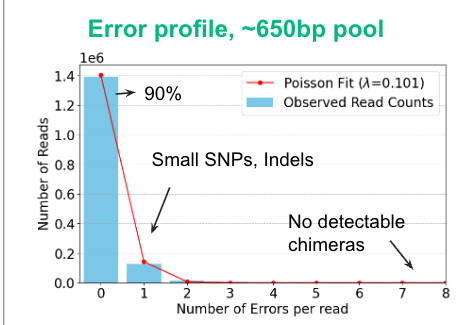 To rigorously benchmark this platform, we assembled multiple gene pools, each consisting of thousands of sequences at lengths between 650bp and 1.8kb. These pools were designed with mean pairwise similarities up to 97%, classifying them as “chimera-prone” if they were built through standard pooled assembly methods. We then employed high-fidelity PacBio single-molecule sequencing to precisely quantify the percentage of perfect molecules (no synthesis errors, template switching, or chimeras).